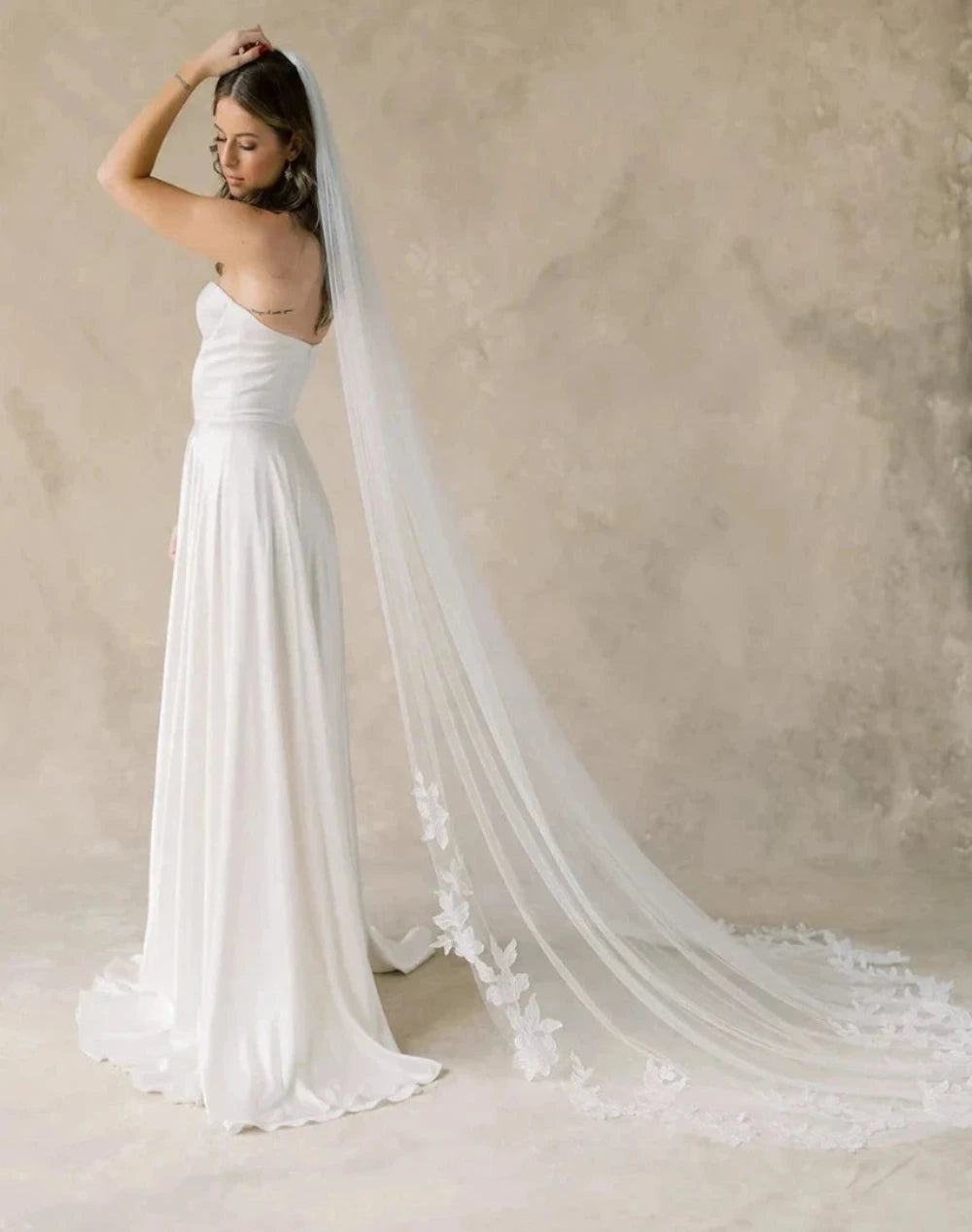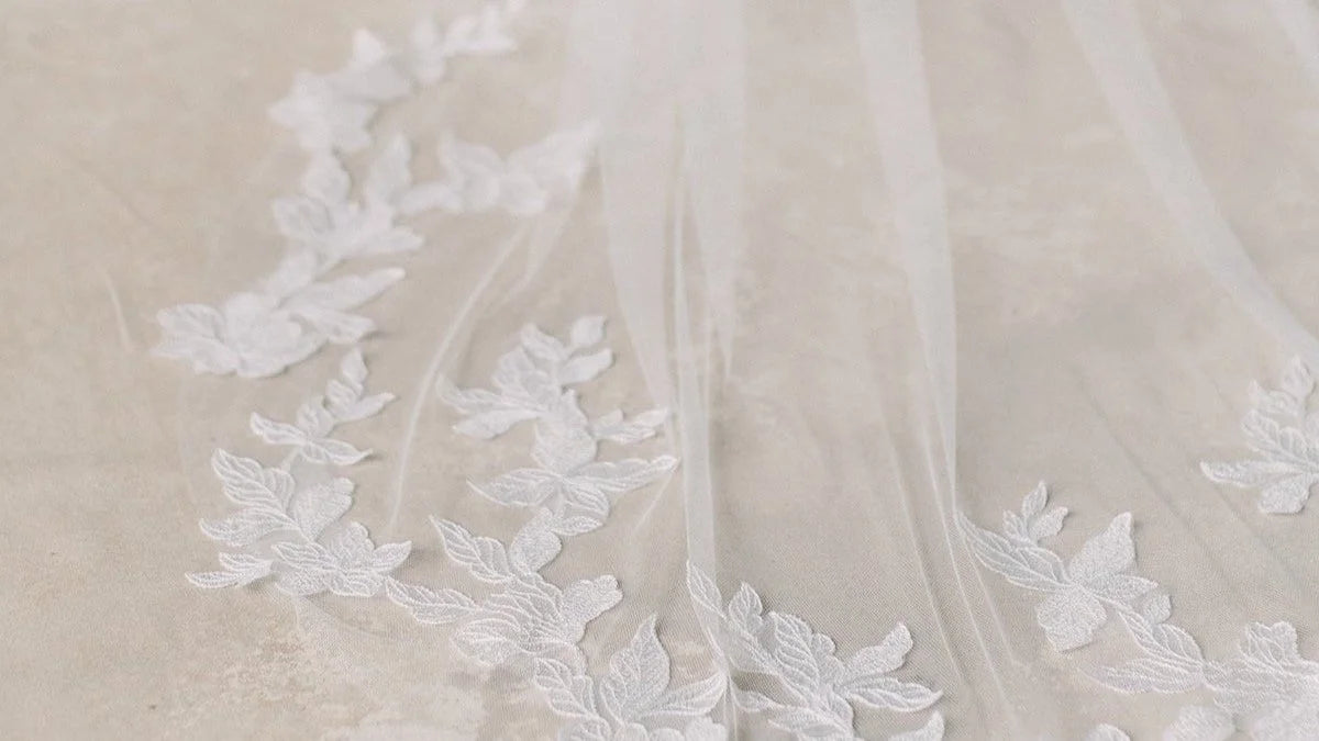 Soft luxe English tulle gathered into a high-end, metal comb. Delicate botanical lace appliqués are hand sewn along the bottom edge of the veil for extural interest and a soft, romantic feel. Cathedral Length (108").